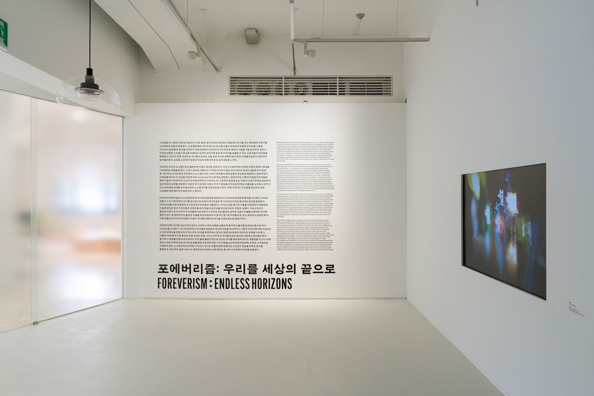 《포에버리즘: 우리를 세상의 끝으로》는 이러한 시대적 경향을 관찰하며 독자적인 출구를 모색하는 동시대 작가 12인(팀)을 소개한다. 전시에 참여하는 작가들은 영원함의 속성에 의문을 제기하거나 시청각 이미지에 의해 구성되는 서사와 정체성을 면밀히 탐구하는 한편, 파산을 유예하려는 정치의 공회전으로부터 자의적인 표류를 시도한다. 이들은 1980년대 이후 촉진된 연결 상태의 과열, 그리고 이미지의 과다를 현실의 토대로 인정하고 받아들이면서, 동시에 그 경향을 반복과 회귀로부터 건져 올려 불능한 것으로 선고된 역사를 재건하려 한다는 공통점을 지닌다. 이와 같은 노력은 세계에 관한 진지한 긍정을 통해 영속성에 갇힌 시간 바깥을 상상하도록 제안하며, 안온한 그리움으로 수렴하지 않는 노스탤지어의 외부에 다가선다. 전시는 이들과 함께 현재라는 시간성이 현실을 이루는 방식을 통찰하고, 지금 우리 삶에 나타나는 영원주의의 징후와 그에 답하는 동시대 시각 문화의 양상을 검토한다.