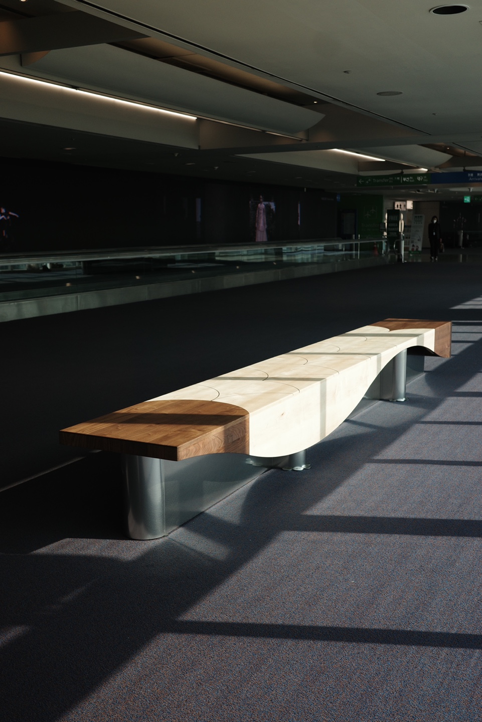 The 4.8-meter-long benches are installed in sets of four on both the west and east sides of the terminal, welcoming all travelers arriving from abroad to take a moment to rest.